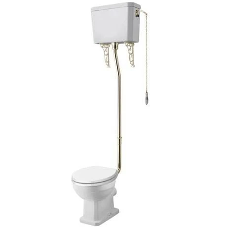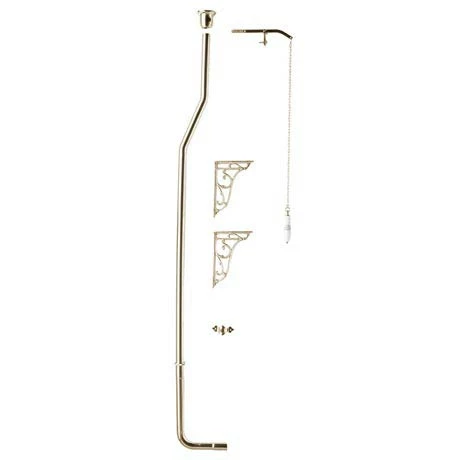 A gold plated traditional Victorian style high level WC flush pipe set, perfect for providing a period look in any home, includes a high level flush pipe, fulcrum lever, chain pull and ornate cistern support brackets.