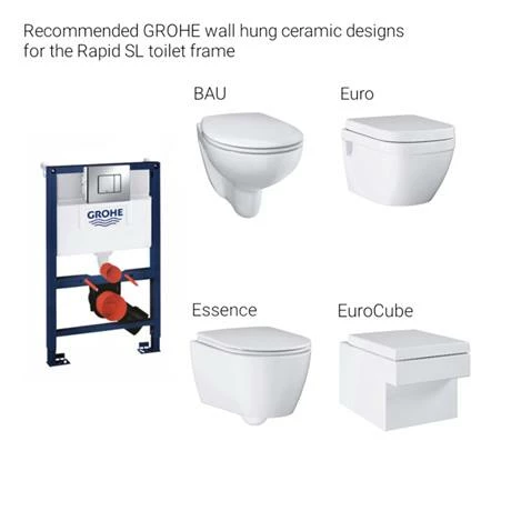 The Rapid SL Low Noise 3 in 1 Set Support Frame for Wall Hung WC gives you the freedom to design your ultimate bathroom by providing a secure and quick method of installing WCs. Complete with the Skate Cosmopolitan chrome flush plate, it features GROHE Whisper®, preventing any sound from traveling to adjoining rooms while GROHE EcoJoy® flush technology reduces your water consumption by up to 50%. The dual flush system provides two buttons, allowing you to select a flush volume of either 3 or 6 liters (or 3 and 4.5 liters, depending on the ceramic body). Each frame comes pre-assembled with sanitary ware fixings and is subject to stringent testing – Grohe WC frames are tested to hold 400kg.