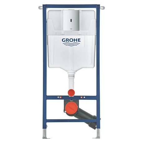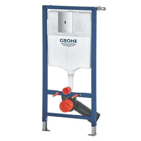 The Grohe Solido 3-in-1 set for wall hung toilets offers state-of-the-art technology, including touchless activation, for maximum convenience and hygiene. The steel frame has a certified load-bearing capacity of over 400 kg, making it perfectly safe and extremely stable. The GROHE Whisper technology minimizes sound transmission to adjoining rooms. The installation is straightforward and hassle-free thanks to the GROHE QuickFix system, allowing you to mount it either in front of a solid wall or inside a stud wall. No tools are required to connect hose, inspection shaft and water supply. The Tectron Bau E flush plate with long lasting battery has an integrated infra-red sensor, that detects hand or body movement, so water runs without you needing to pushing any buttons. This means there is an automatic flush after you leave the toilet.ย