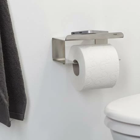 This toilet roll holder with shelf from the Tiger Colar range is stylish and completely on-trend. The integrated shelf offers practical storage space for toiletries or mobile phone. The Colar toilet roll holder can be mounted in its entirety with the supplied strong, double-sided 3M tape.